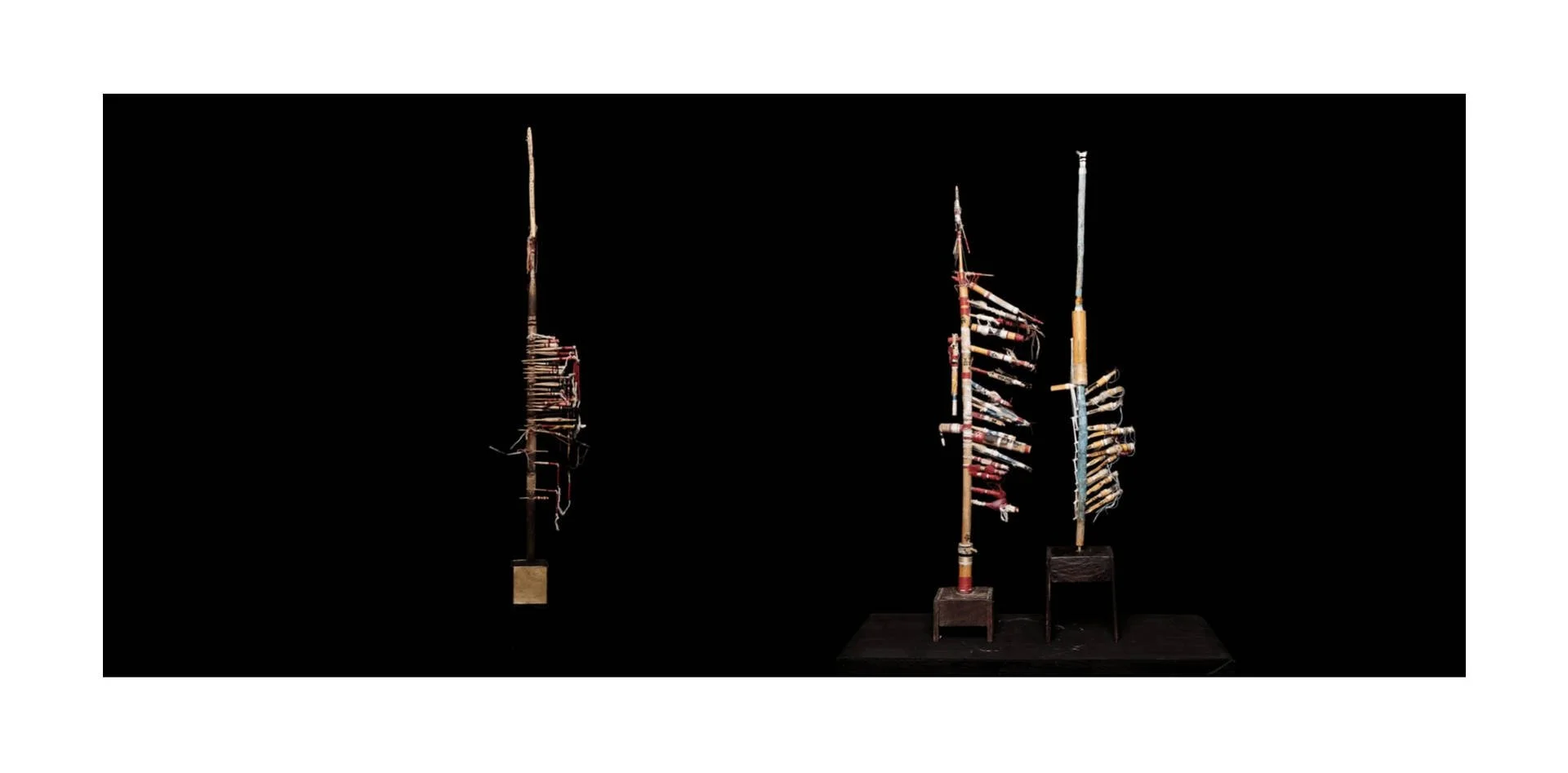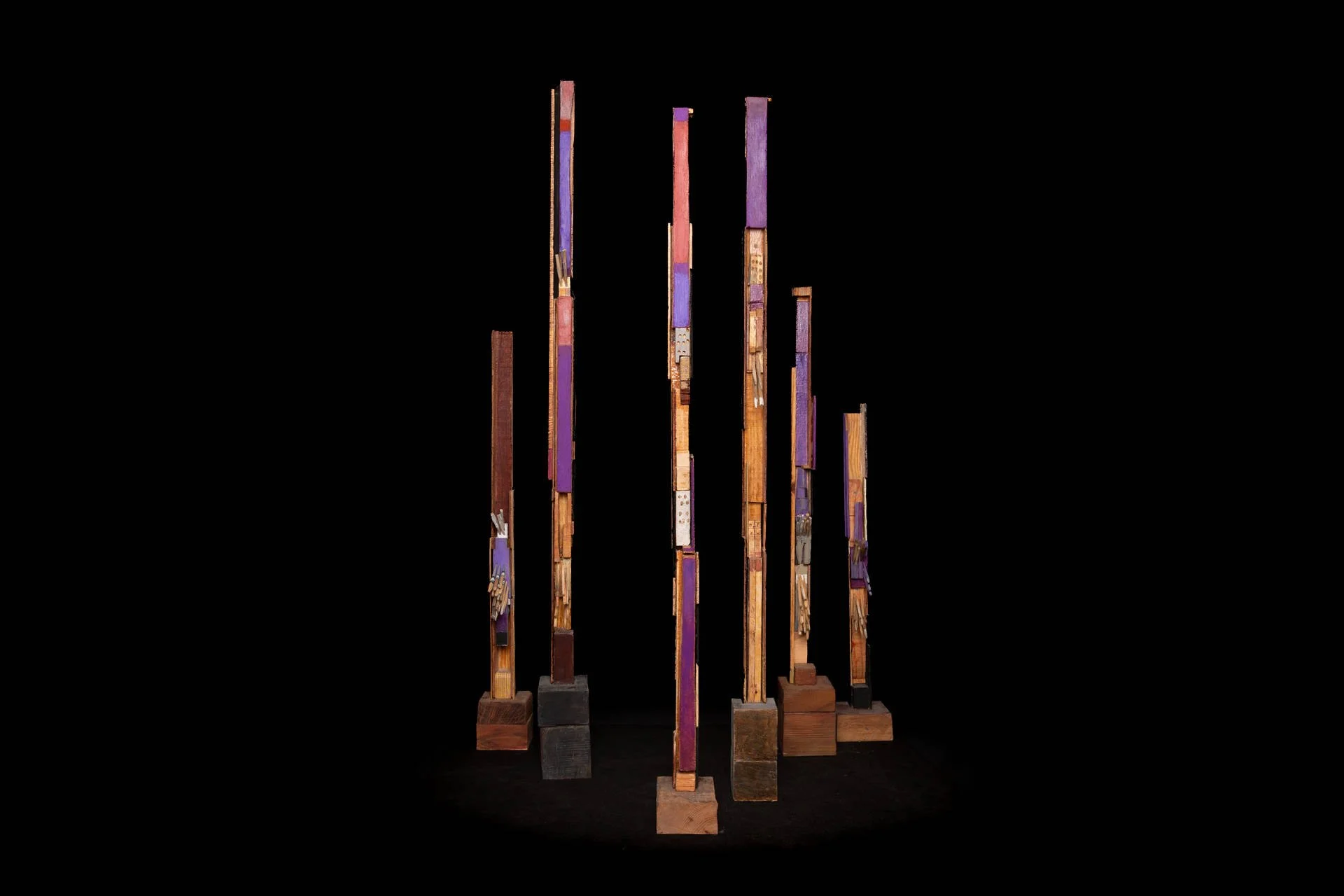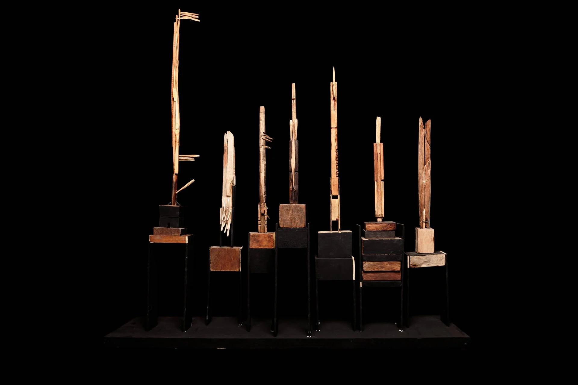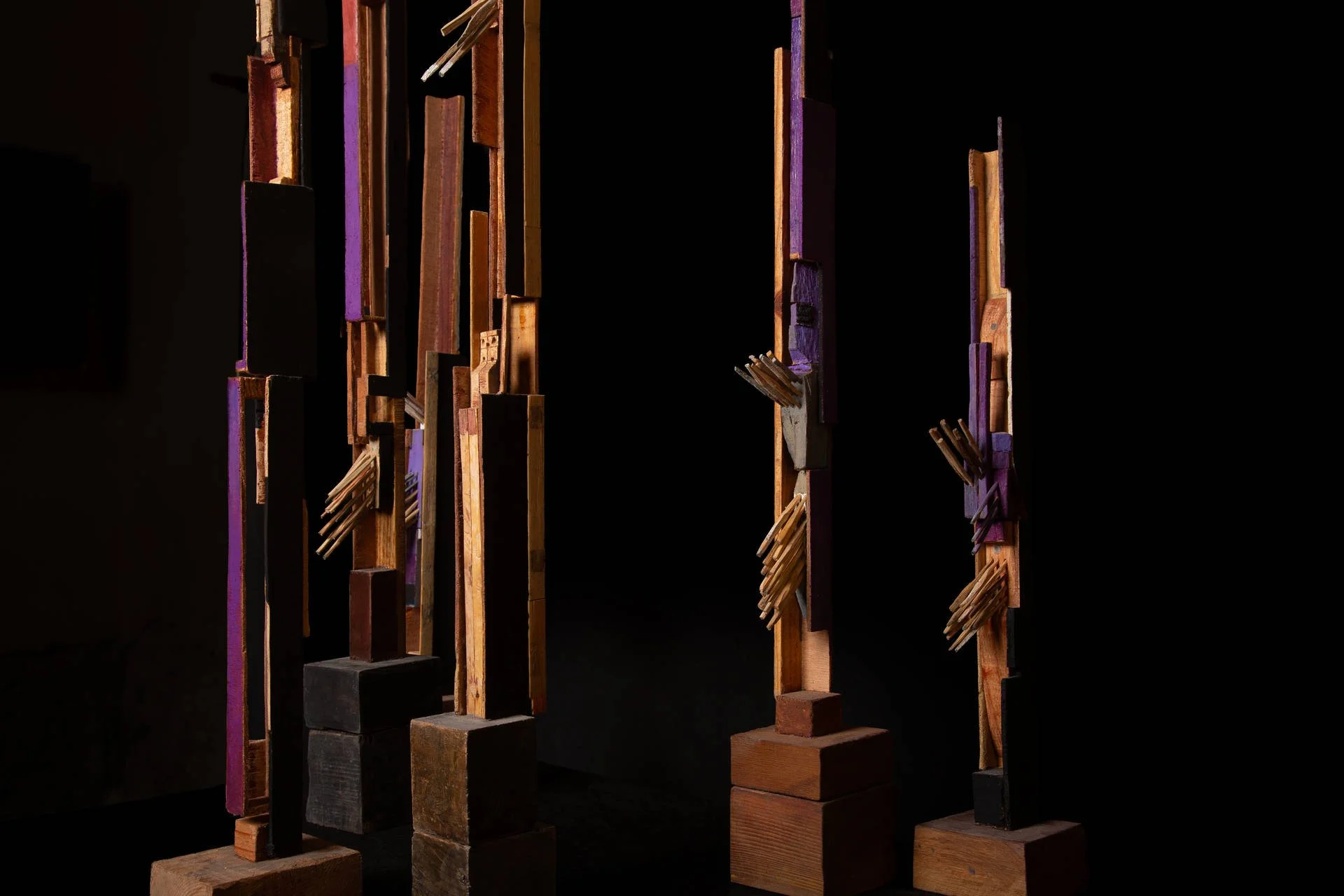 Fragments of wood carved with a knife, assembled around a vertical base, like a mast, form living and precise structures. Each element retains its singularity, yet finds its place within a whole. These ensembles become like signposts in space: