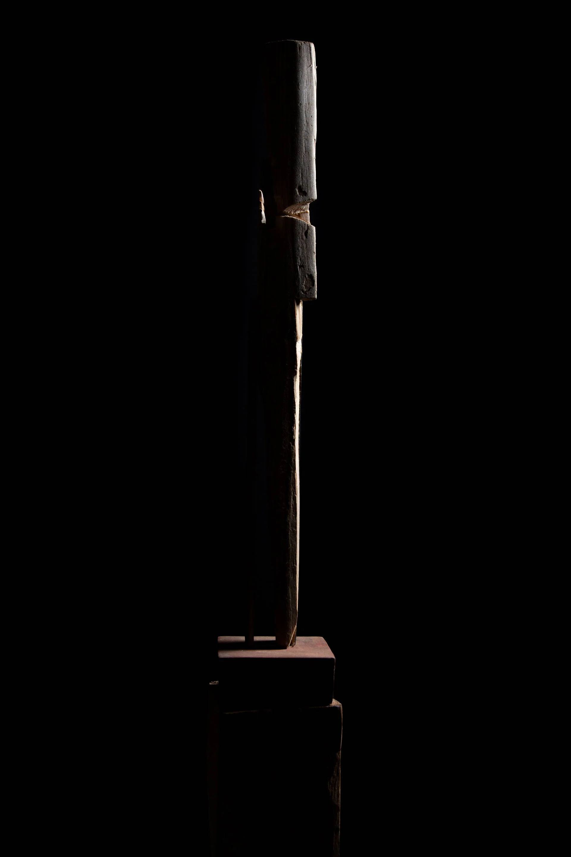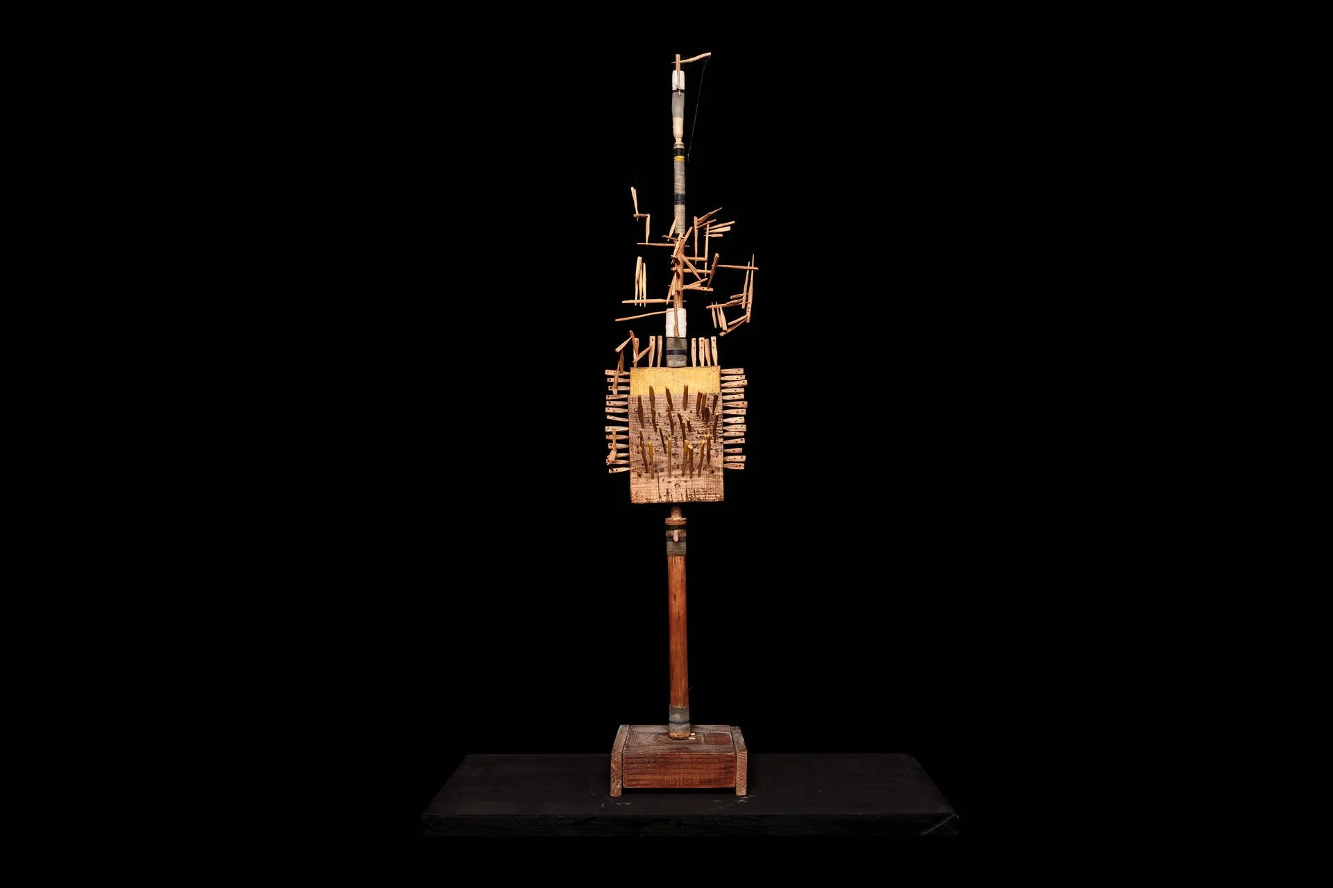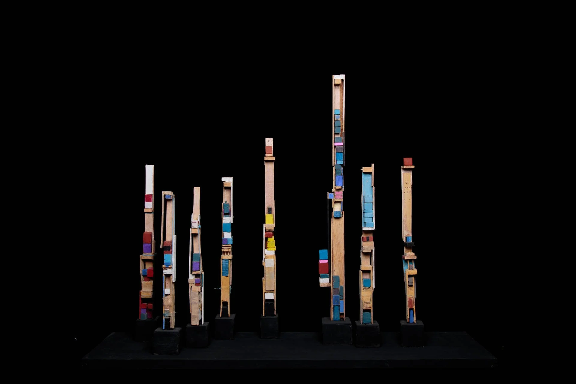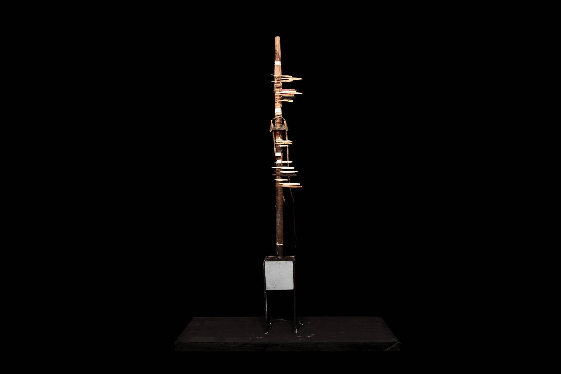 Fragments of wood carved with a knife, assembled around a vertical base, like a mast, form living and precise structures. Each element retains its singularity, yet finds its place within a whole. These ensembles become like signposts in space: