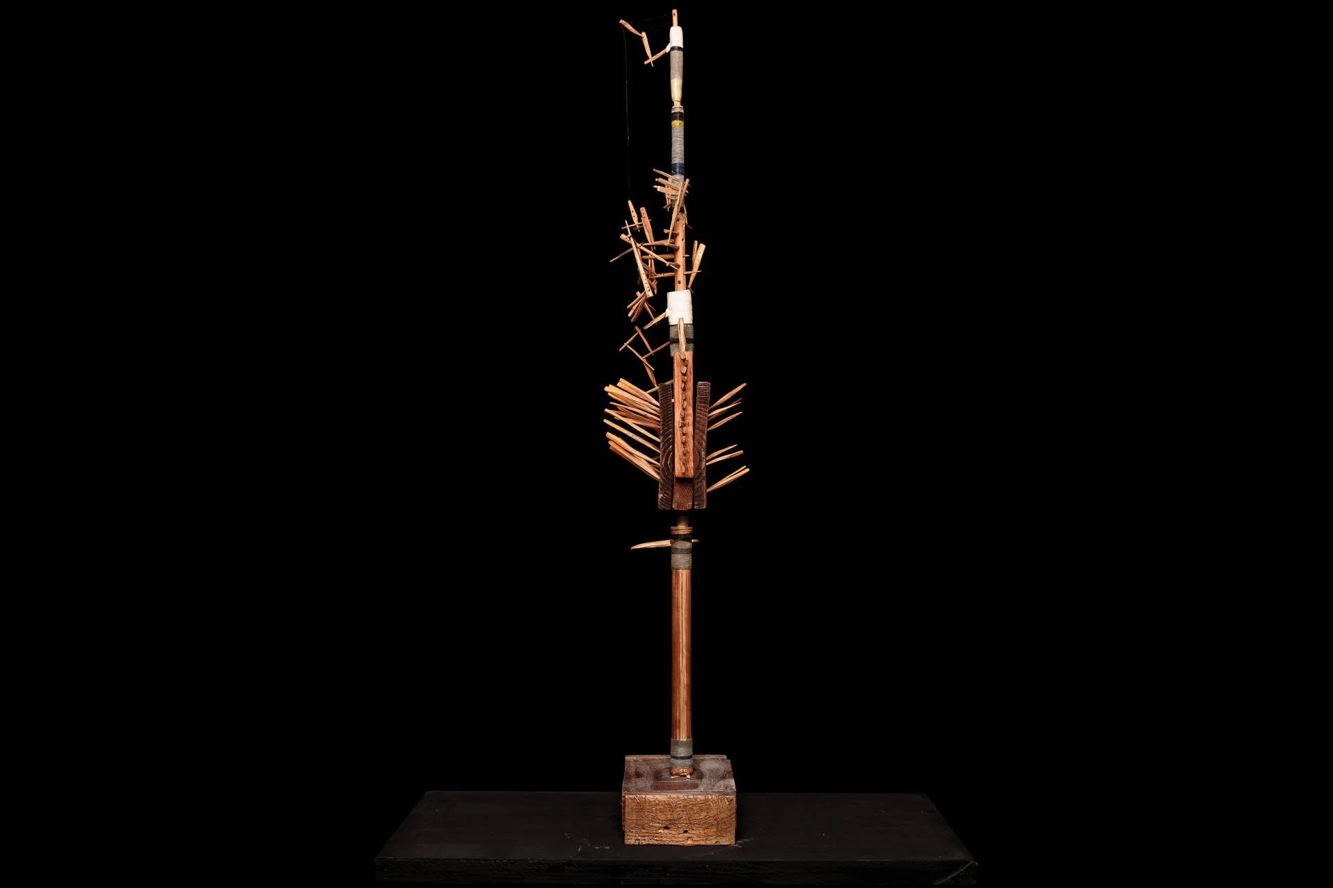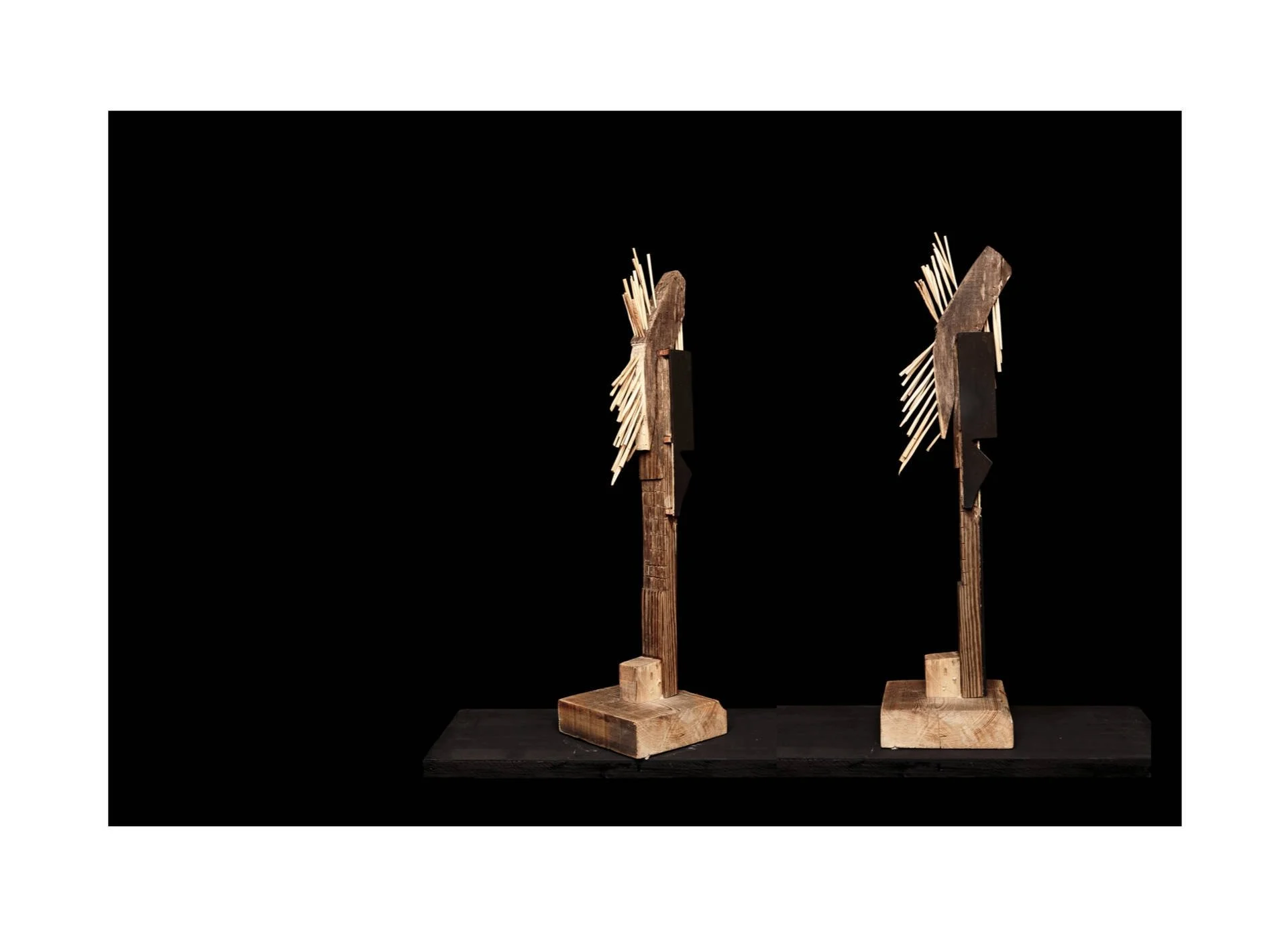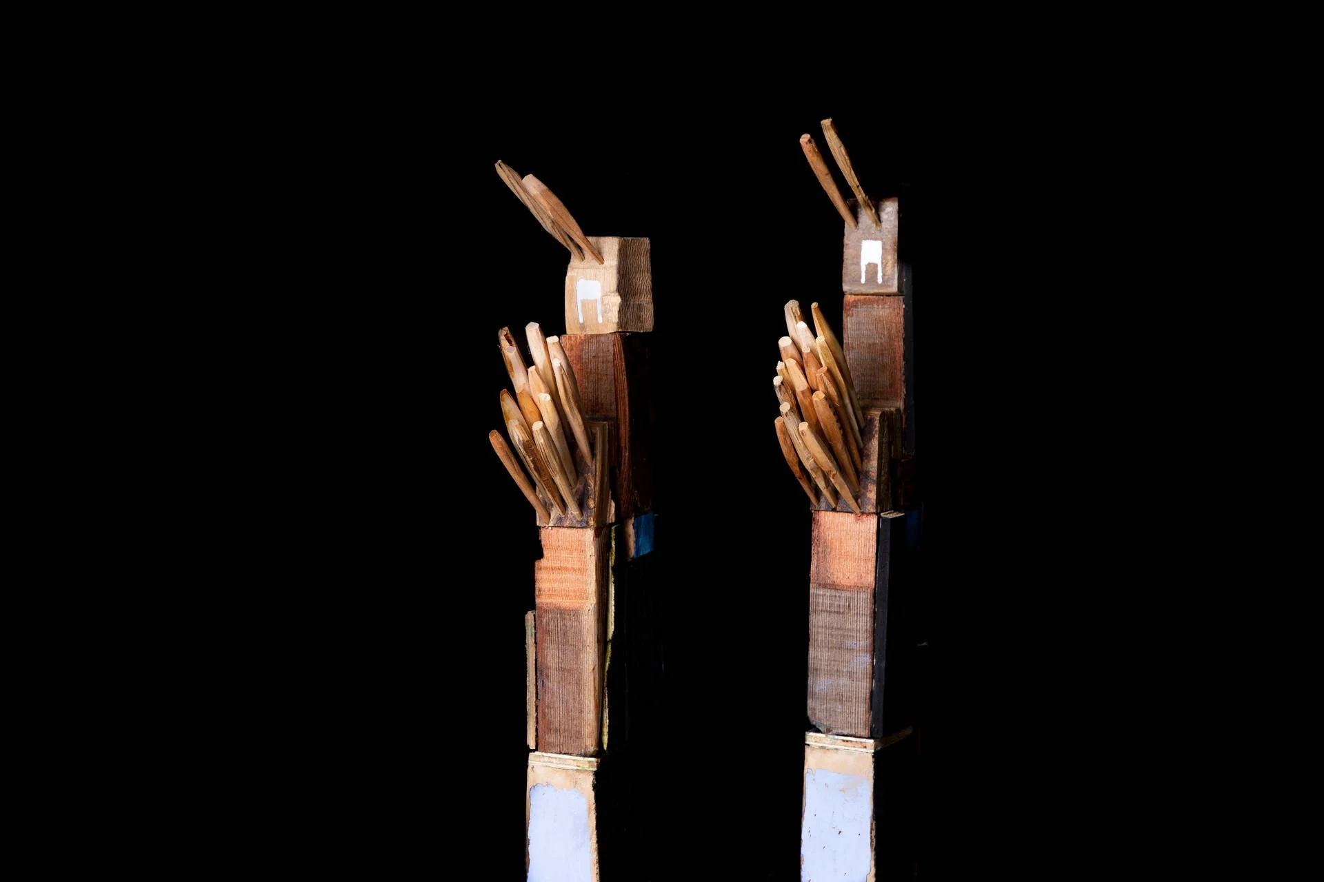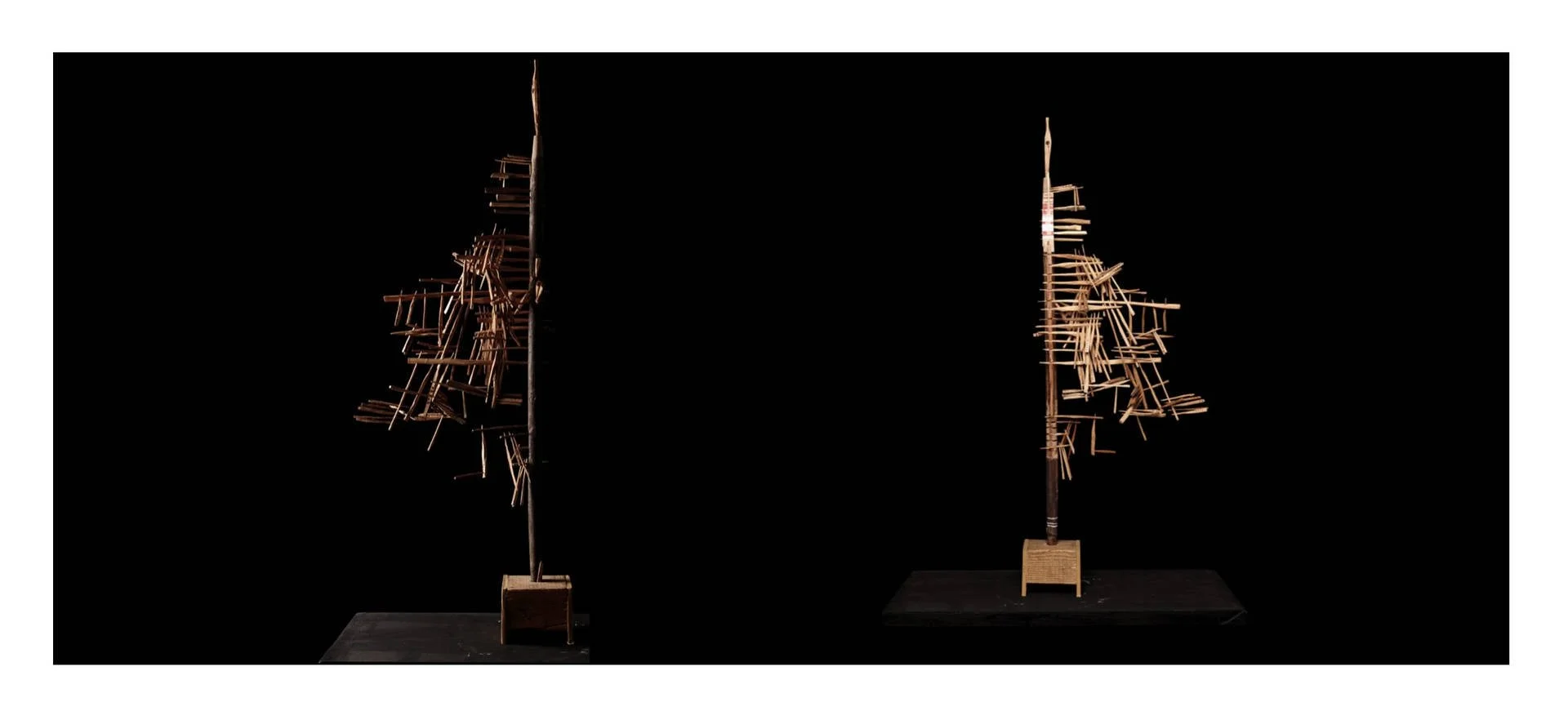 Fragments de bois taillés au couteau, reliés autour d’une base verticale, tel un mat, qui forment des structures vivantes et précises. Chaque élément conserve sa singularité, mais trouve sa place dans un ensemble. Ces ensembles deviennent comme des signalisations dans l’espace :