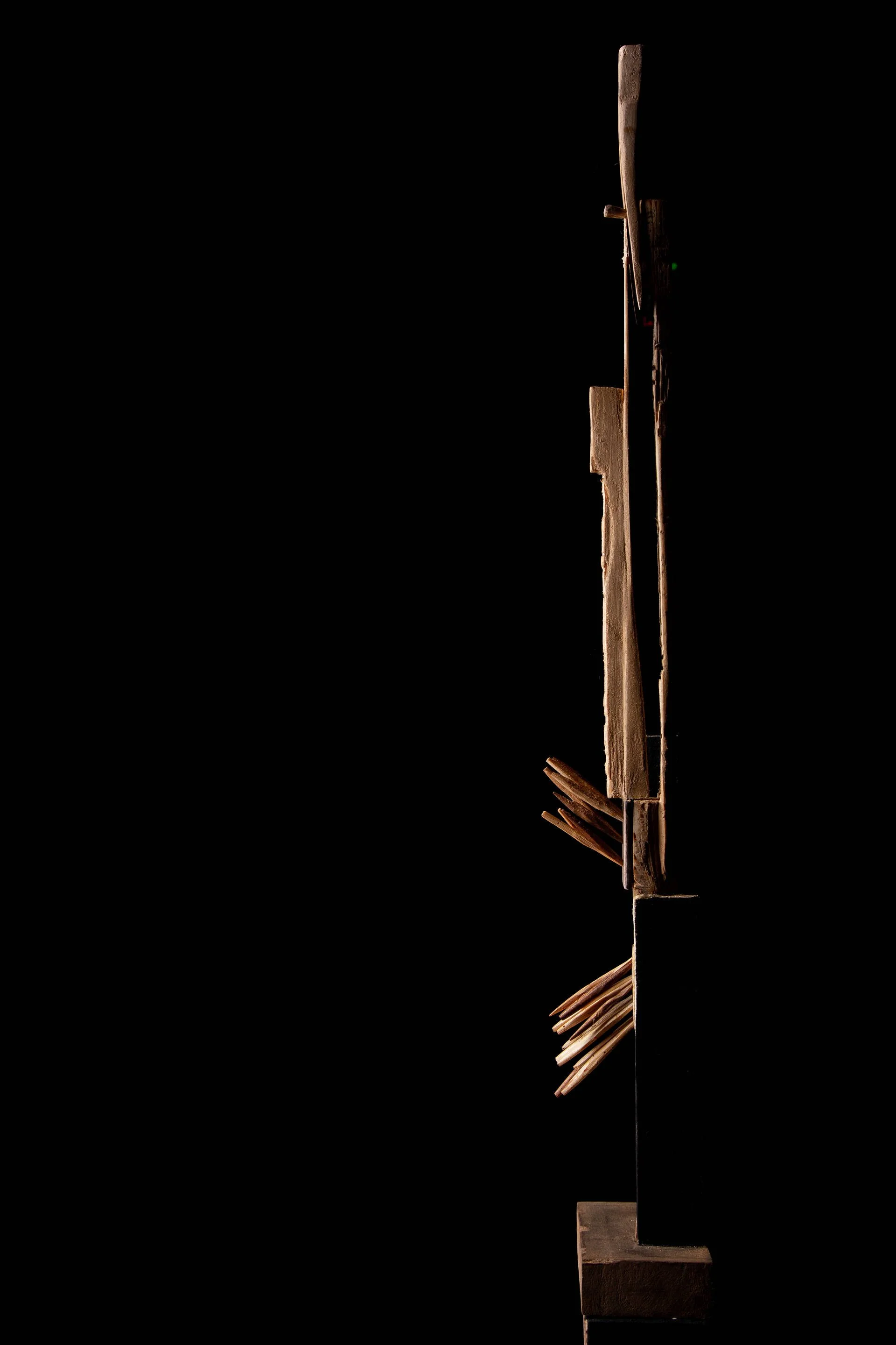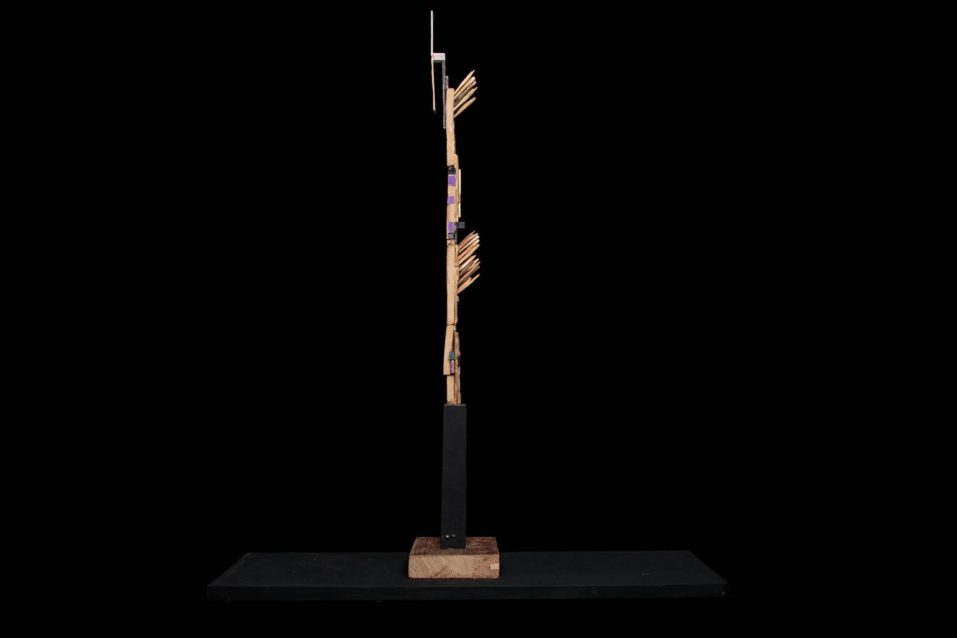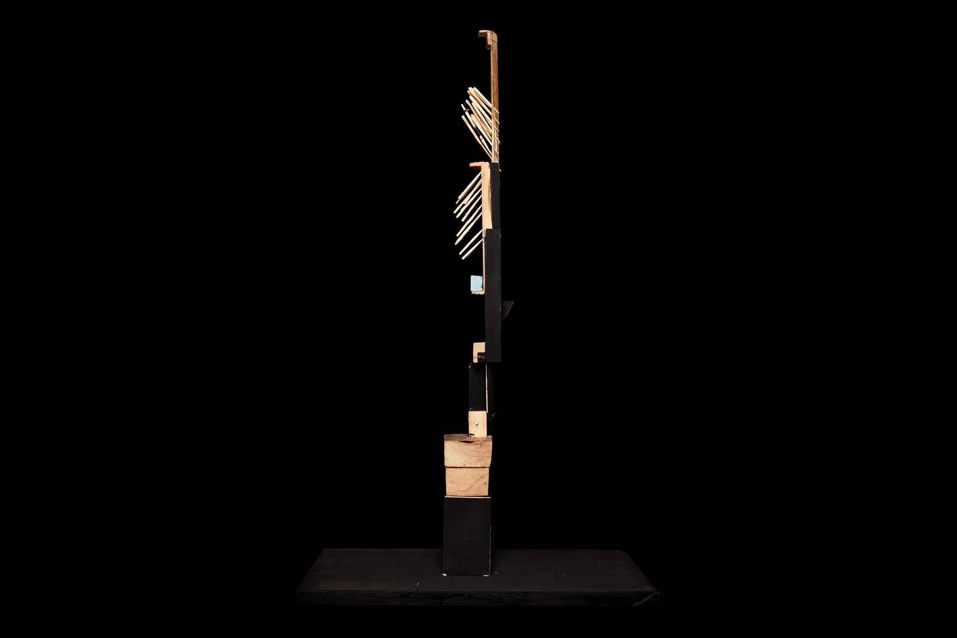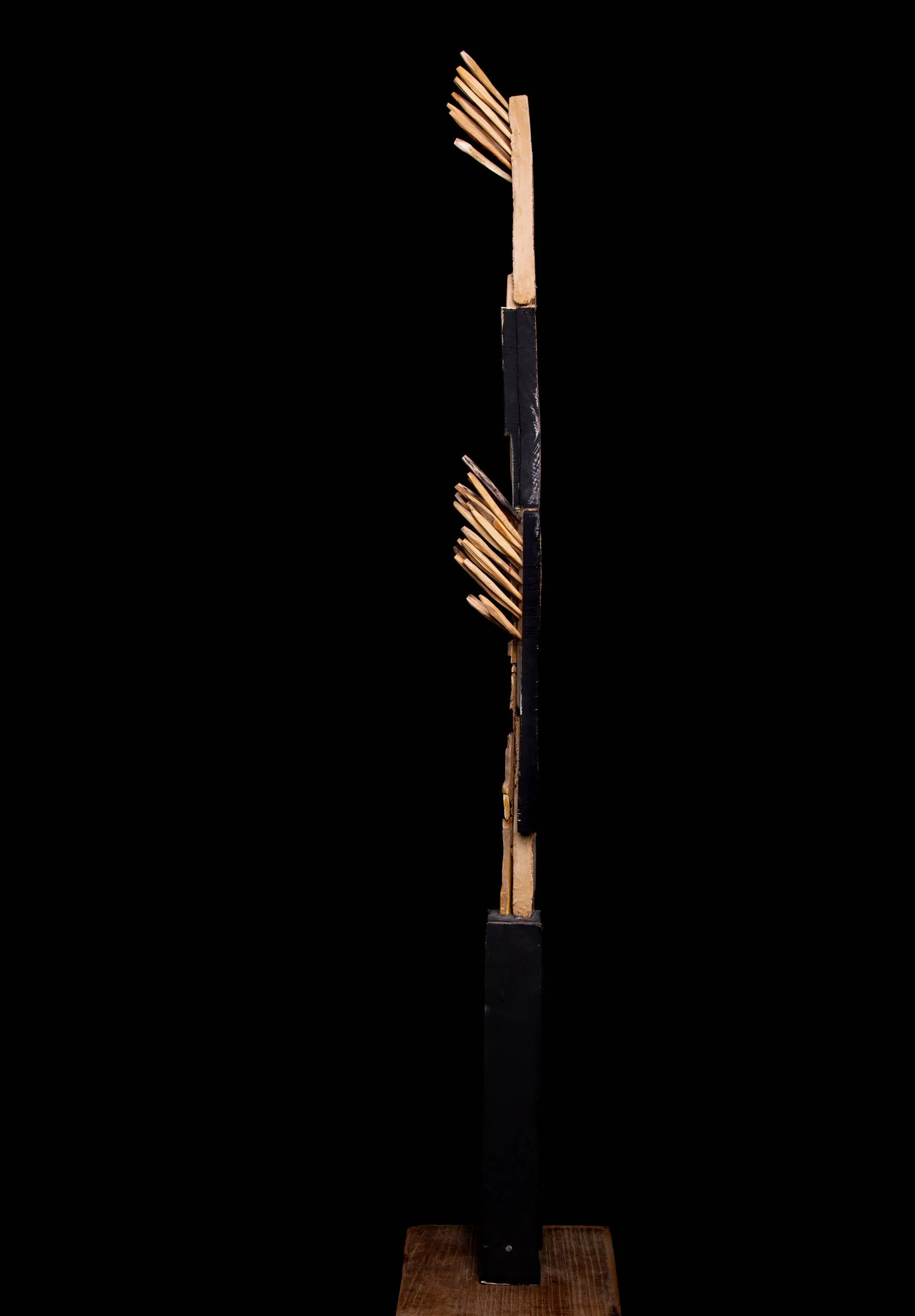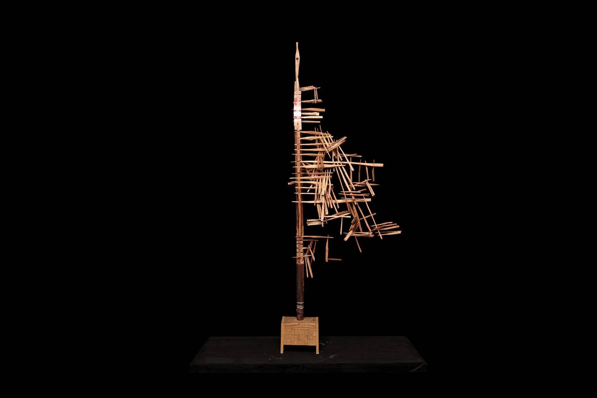 Fragments de bois taillés au couteau, reliés autour d’une base verticale, tel un mat, qui forment des structures vivantes et précises. Chaque élément conserve sa singularité, mais trouve sa place dans un ensemble. Ces ensembles deviennent comme des signalisations dans l’espace :