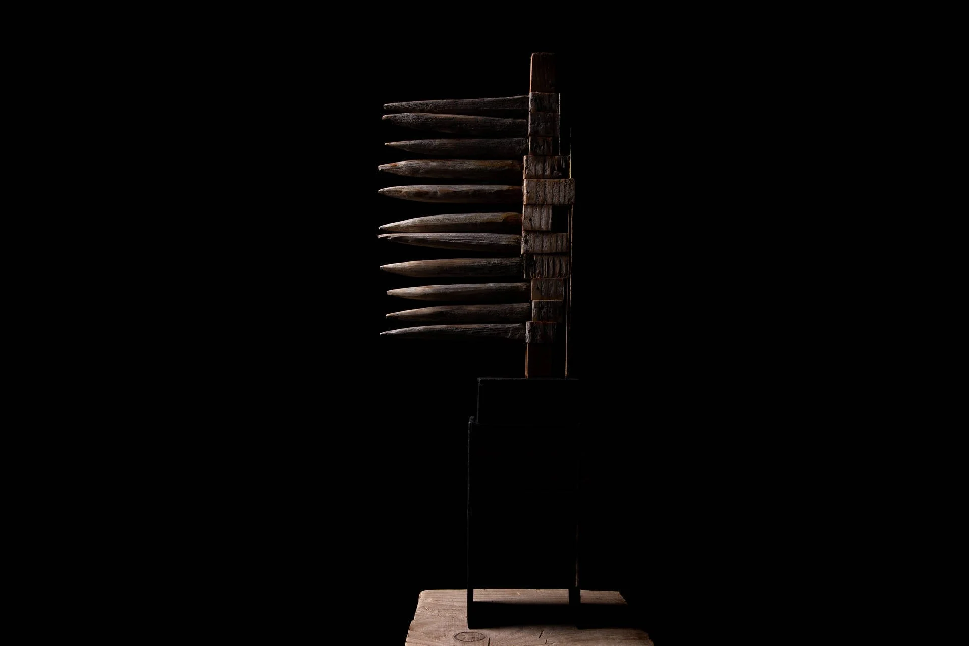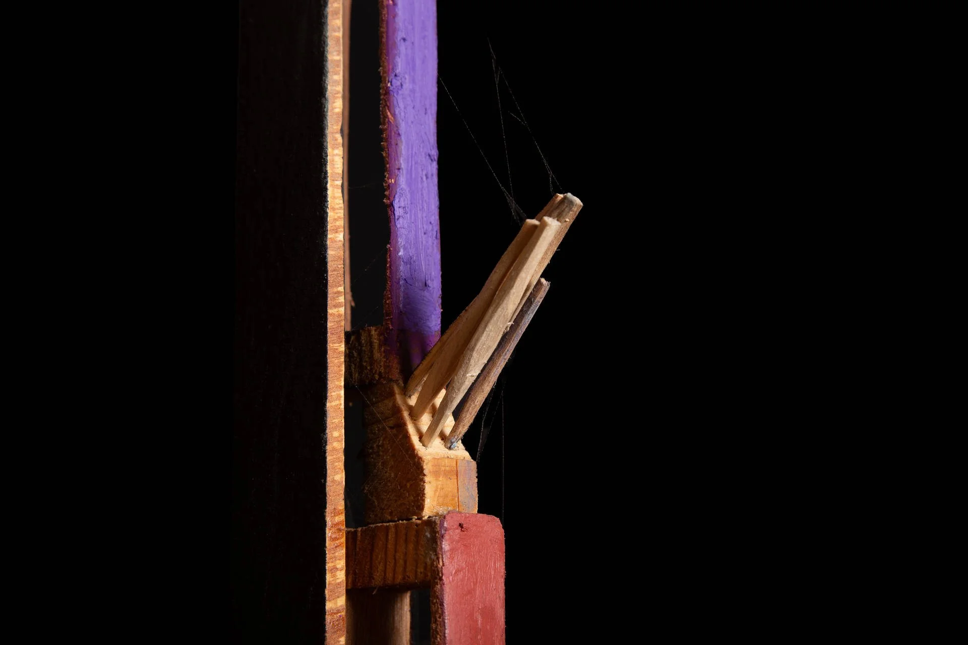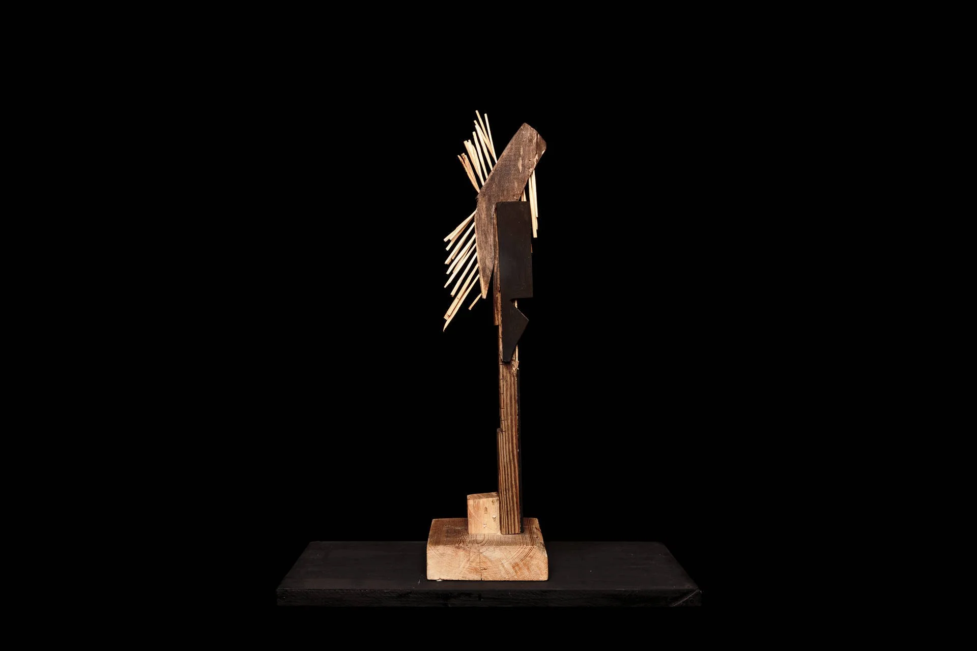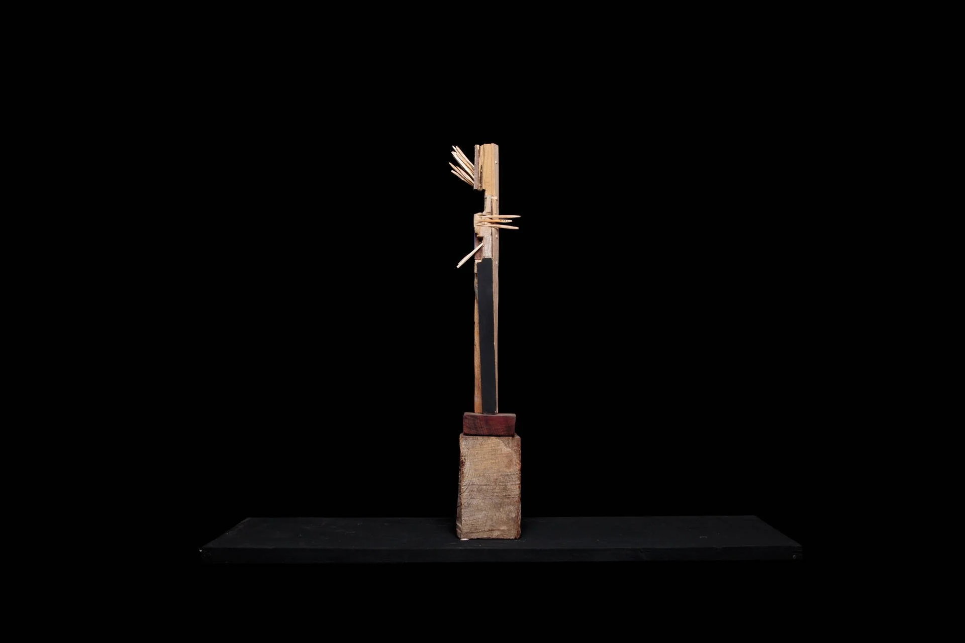 Fragments de bois taillés au couteau, reliés autour d’une base verticale, tel un mat, qui forment des structures vivantes et précises. Chaque élément conserve sa singularité, mais trouve sa place dans un ensemble. Ces ensembles deviennent comme des signalisations dans l’espace :