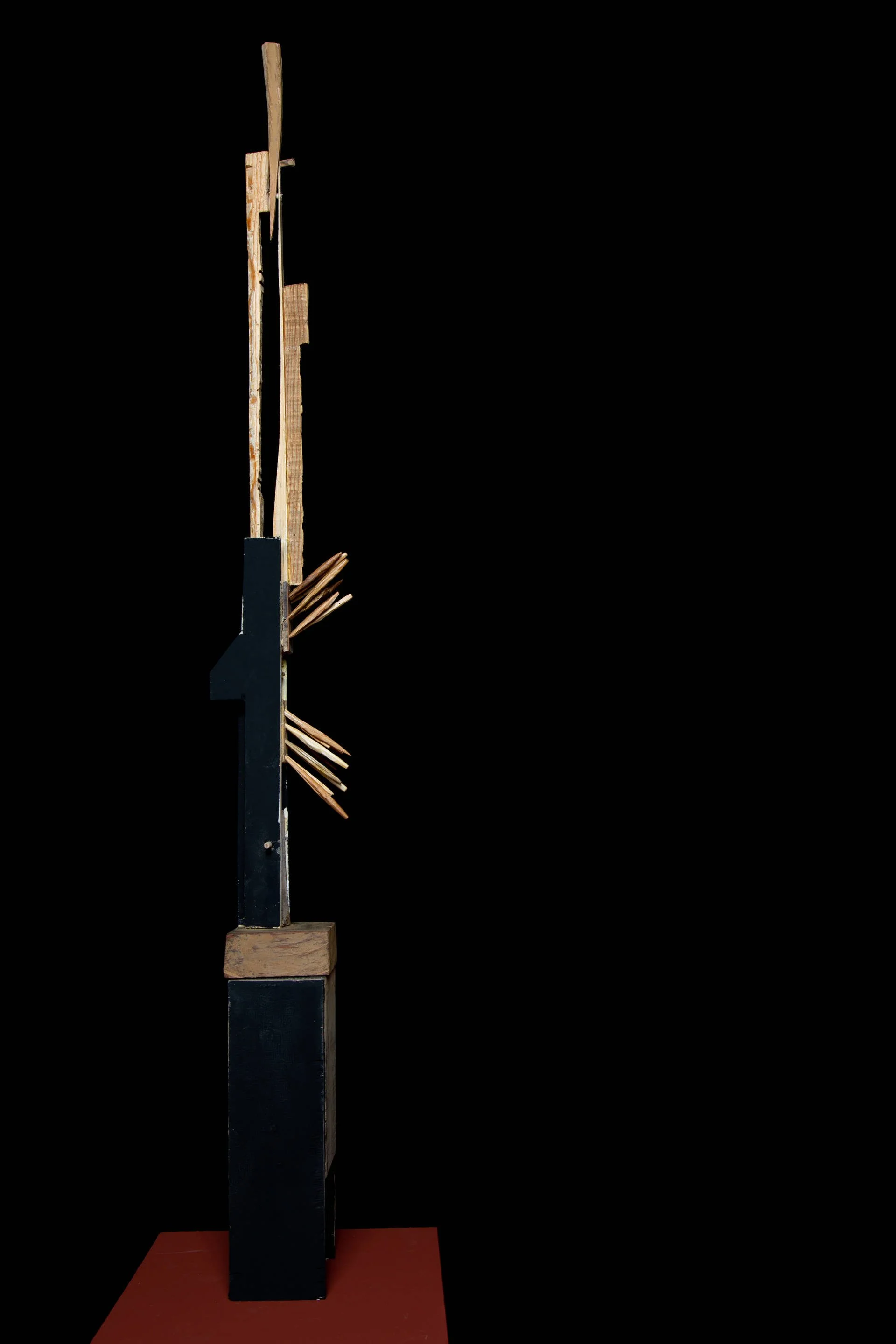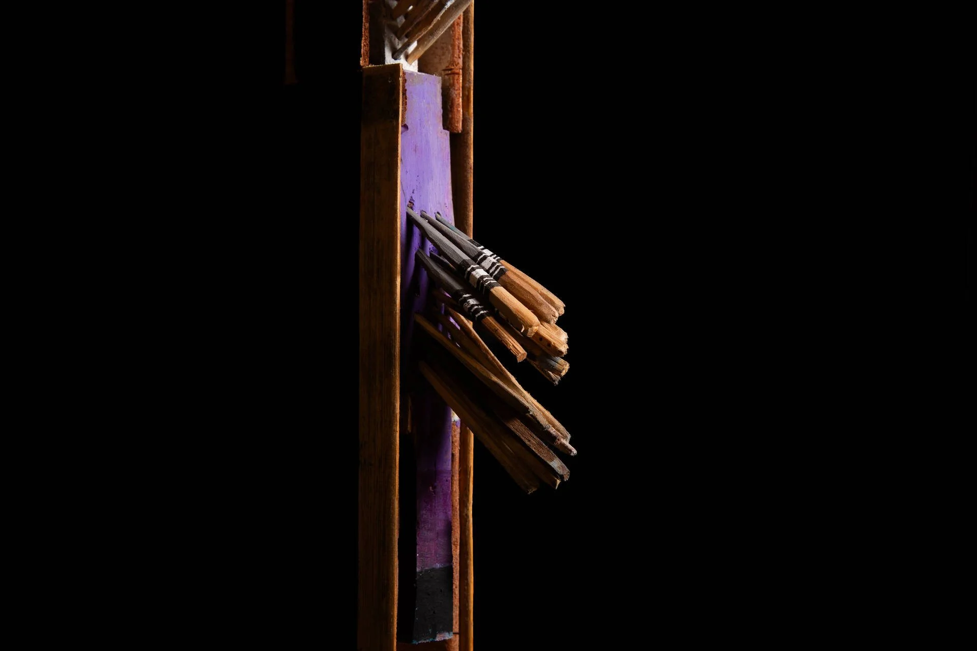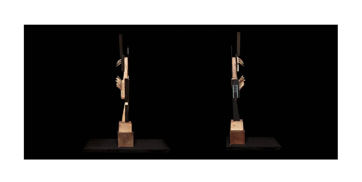 Dans mon travail, chaque morceau de bois, taillé ou trouvé, devient un objet transitoire : éphémère mais chargé de transformation. Assemblés autour d'un mat — principe d’unité — ces fragments singuliers forment une « famille », un tout vivant et cohérent. La structure ainsi créée agit comme une signalisation : elle oriente, relie, et interroge notre rapport au passage, à la continuité et à l'interdépendance. La quantité n’est pas une simple addition d’éléments, mais la densité d’un lien invisible : une manière de capter le mouvement du monde et de rendre tangible l’indicible.