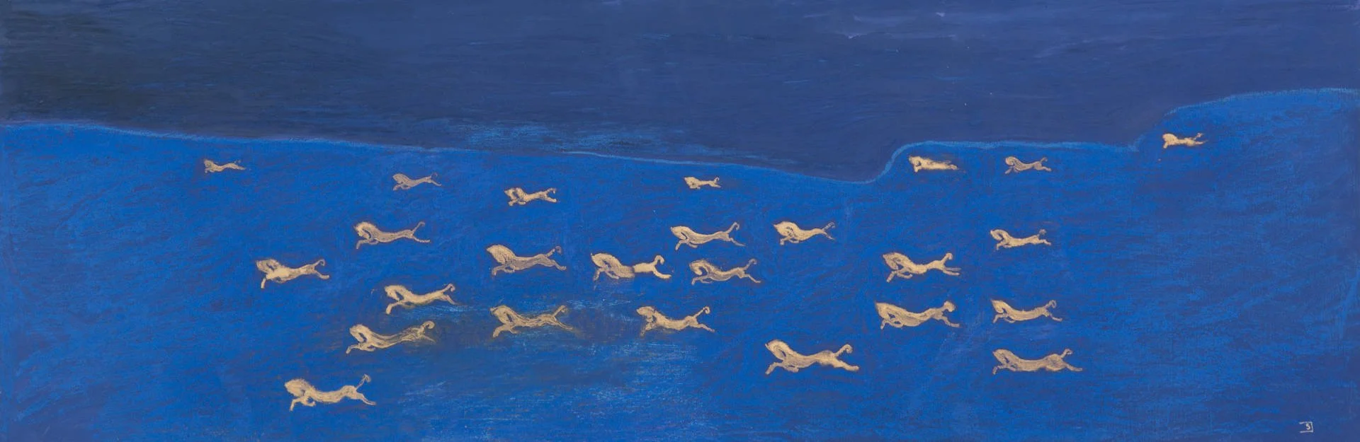 À sa surface sont peints 108 chevaux en or : silhouettes fugitives, forces en mouvement.